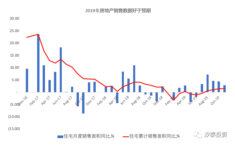 一、2019年市场情况回顾:结构性投资机会显著 不同于2018年市场整体下跌,2019年各市场指数涨幅在20-40%之间,市场整体上涨集中在全年前4个月,其余时间震荡,全年不乏结构性投资机会。 数据来源:Wind 分板块表现看,大消费和科技显著跑赢大盘。2019年下半年以电子计算机为代表的科技和以建材、轻工和家电为代表的房地产竣工产业链表现突出。 数据来源:Wind 数据来源:Wind 二、2019年经济整体好于预期,稳中放缓趋势在2020年预计延续 尽管2019年对内面临债务压力,对外面对中美贸易摩擦的负面冲击,但在宏观逆周期调控下,加上美国从之前缩表重新进入扩表周期,国内经济增速呈现出平稳放缓,好于预期,同时局部呈现亮点,体现出国内经济有一定韧性。 内外压力下,2019年国内GDP增速平稳放缓 数据来源:Wind 消费整体增速平稳回落至8%。 中美贸易摩擦负面影响下,2019年出口受到冲击较大,同比由2018年10%的增长转为负0.3%(截止2019年11月)。 数据来源:Wind 制造业不景气以及出口拖累下制造业投资疲软,同时基建投资拉动今年截至11月累计同比仅4%,托底力度低于预期。但整体固定投资增速较去年仅放缓0.7个百分点,得益于房地产投资的贡献,明年这一趋势预计将延续。 数据来源:Wind 房地产行业库存仍处在较低水平,在“房住不炒、因城施策”的大方向下,调控回旋余地较大,今年以来无论是销售面积还是投资拉动均超出预期,对经济起到了显著托底作用。 房地产行业库存水平仍在较低水平,中期库存水平从2014年高位的25个月去化降低至目前不到14个月,此外根据供需指标(新开工面积*0.95/销售面积)看,近3年保持在1左右,反映库存水平不高。 数据来源:统计局,华创证券 房地产销售好于预期,2019年住宅销售7月以来同比转正拉动2019年1-11月实现了住宅销售面积正增长,明显好于全年同比下滑5%以上的预期。 数据来源:Wind
